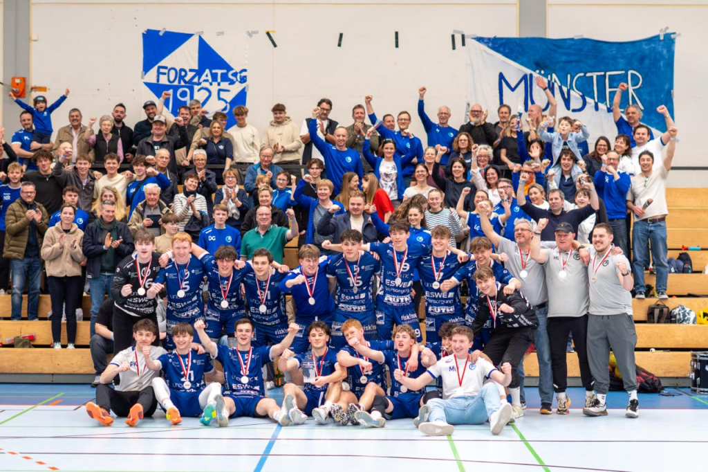 Wow!…was war das für eine tolle Atmosphäre in der pickepacke vollen Eichendorffhalle in Münster. Zwei Fanlager, die ihre Teams fair und lautstark unterstützten, zwei Teams, die sich einen heißen Kampf lieferten, zwei Schiedsrichter, die das Spiel jederzeit im Griff hatten und ein Team, das als solches auch auftrat und den Hessenmeistertitel nach Wiesbaden holte.