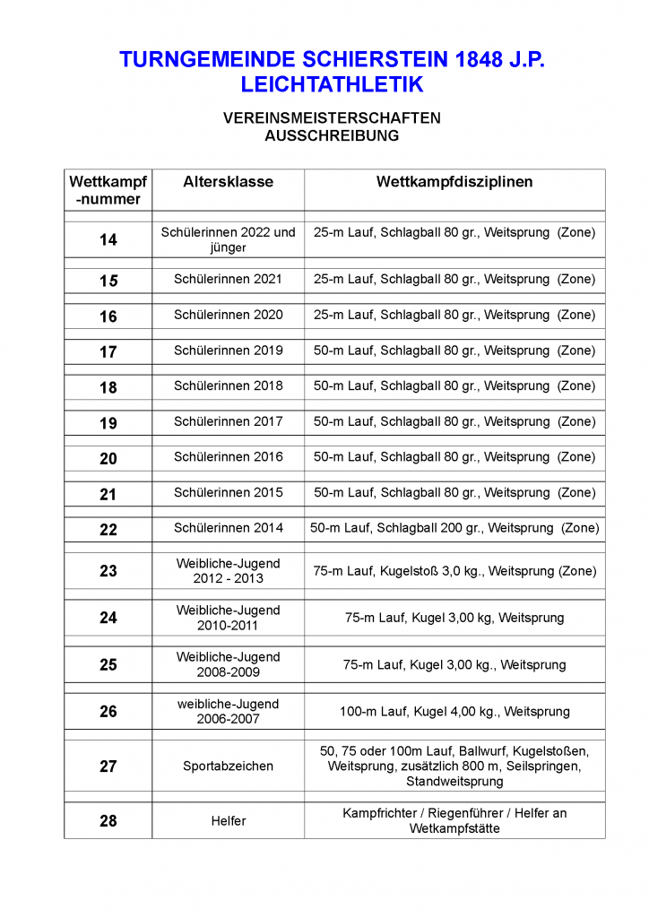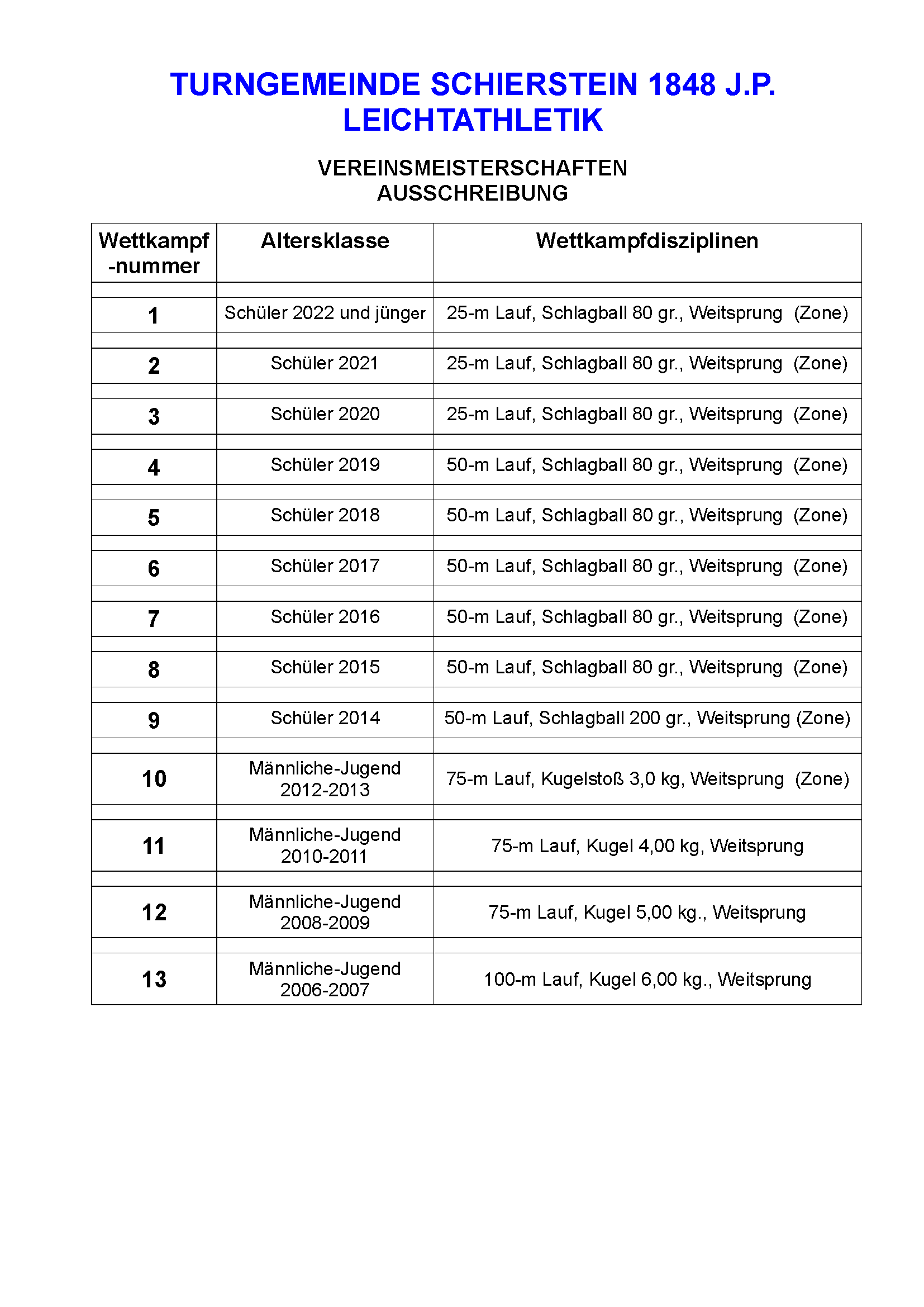 Um einen reibungslosen Ablauf zu gewährleisten, bitte ich alle Übungsleiter bis spätestens Mittwoch, den 24.09.2025, um eine namentliche Meldung mit Jahrgang der einzelnen Wettkämpfer sowie den Wettkampfdisziplinen. Die Meldungen können mir mittwochs zwischen 17:00 und 18:30 Uhr auf dem Sportplatz ,,Saareck“ gegeben werden oder auch per E-Mail unter folgender Adresse leichtathletik@tg-schierstein.de zugesandt werden.